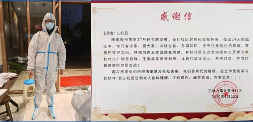 英雄出自平凡,在此次疫情战役中,涌现出很多甘于奉献的志愿者,中心通信部的白红昌就是其中一位。他主动请缨加入所在社区的党员突击队,挨家挨户了解收集小区困难家庭的所需所盼,及时与群众沟通,建立互助群,累计服务群众900余人次,用大爱和行动书写了知识产权青年的责任和担当。 正是像切削加工室和白红昌这样的集体和个人,用一个个奔波忙碌的身影,一幅幅感人至深的画面,一句句朴实有力的话语,聚成了暖人心田的非凡能量,筑牢了疫情防控的坚实屏障,展现着中心广大青年职工最好的模样。 1月29日,郑州市成功摘“星”,但是疫情还没有结束,战斗还在继续,审协河南中心将一如既往,认真落实局和地方各项防疫部署,克服麻痹思想、厌战情绪和侥幸心理,筑牢防疫关,绷紧安全弦,坚决打赢疫情防控这场硬仗。